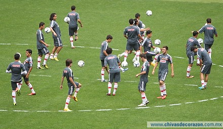 La actividad de este día en el Estadio Omnilife comenzó en punto de las 10 de la mañana con la habitual entrada en calor, que consistió en alargues, con pausas para hacer estiramientos, además de una rutina de golpeo del esférico en el círculo central para mejorar la técnica individual.