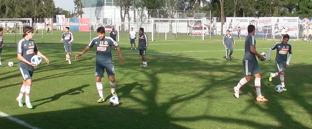 En lo que significó el trabajo más importante de la práctica de esta tarde, el timonel José Luis Real ordenó un ejercicio futbolístico que englobó tres grandes rubros de entrenamiento en uno solo, ya que al montar una cancha de menores dimensiones y equiparla con tres porterías distribuidas con una considerable distancia una de la otra y en diversos puntos del campo, Guadalajara pudo realizar control de pelota, traslado e intensidad de juego en el mismo ejercicio.