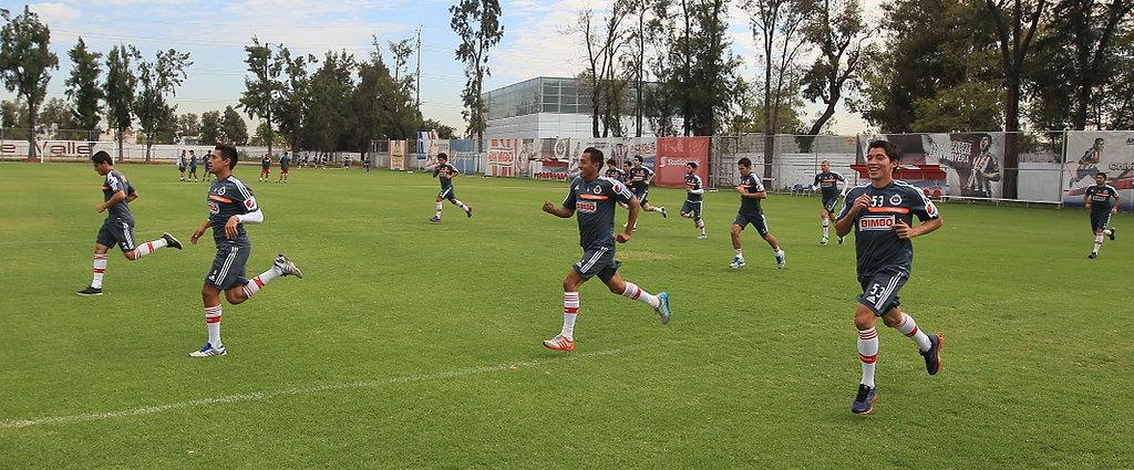 Tras concluir la actividad en el gimnasio, los jugadores de campo regresaron a la cancha para complementar las labores de calentamiento con una rutina de conducción del esférico entre conos para alcanzar el mejor manejo del balón con ambos perfiles y con ello estar listos para trabajar a las órdenes del Director Técnico José Luis Real.
