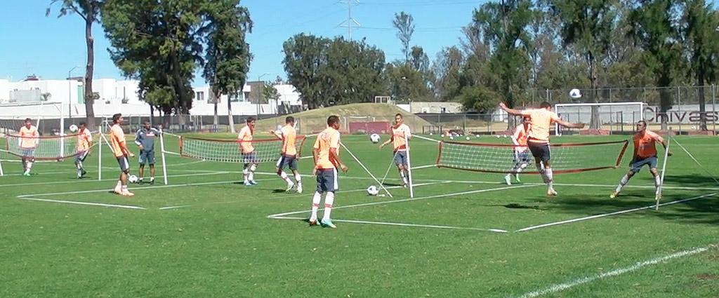 Más adelante, la mayoría de los integrantes de Chivas hicieron una dinámica de torito en un grupo y algunos otros ensayaron tiros libres frontales con barrera de por medio, bajo la coordinación del auxiliar técnico Marco Antonio Ruíz. Para terminar la sesión de trabajo de este martes, los jugadores desarrollaron una competencia de tenis-balón en tres canchas.