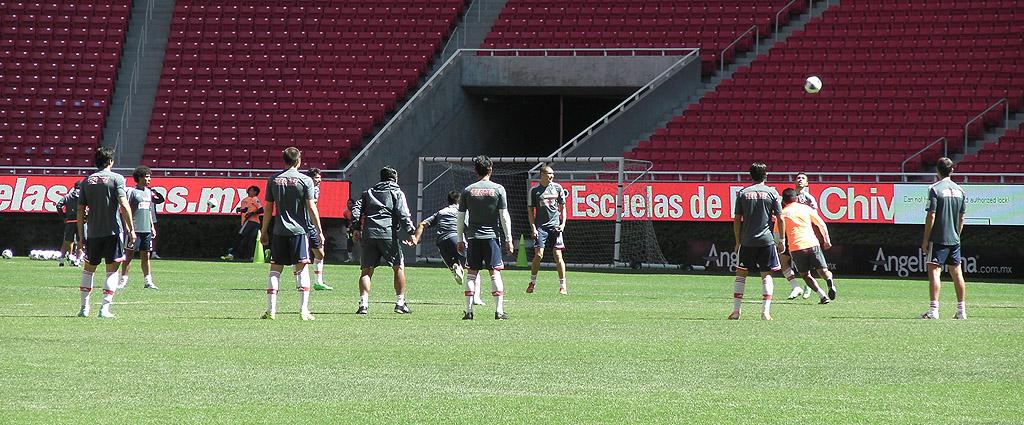 La sesión de entrenamiento de este viernes en el Estadio Omnilife comenzó entre un ambiente muy agradable, pues en la dinámica de torito con la cual inició la entrada en calor también participaron los profesores Marco Antonio Ruiz, Guillermo Hernández y Armando Camacho, quienes estuvieron muy activos junto a los jugadores.