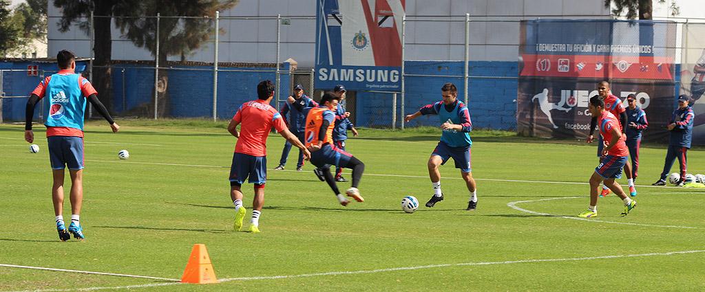Este grupo de jugadores del Guadalajara comenzó el entrenamiento en la Cancha Dos con un trote ligero alrededor del campo para después aumentar la intensidad del calentamiento con una serie de ejercicios de coordinación y potencia, en los cuales había que hacer un recorrido a velocidad con algunos obstáculos.